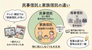 民事信託と家族信託は言葉としては違いますが、意味合いとしてはほぼ一緒なので、特に気にしなくてもいいかなと思います。