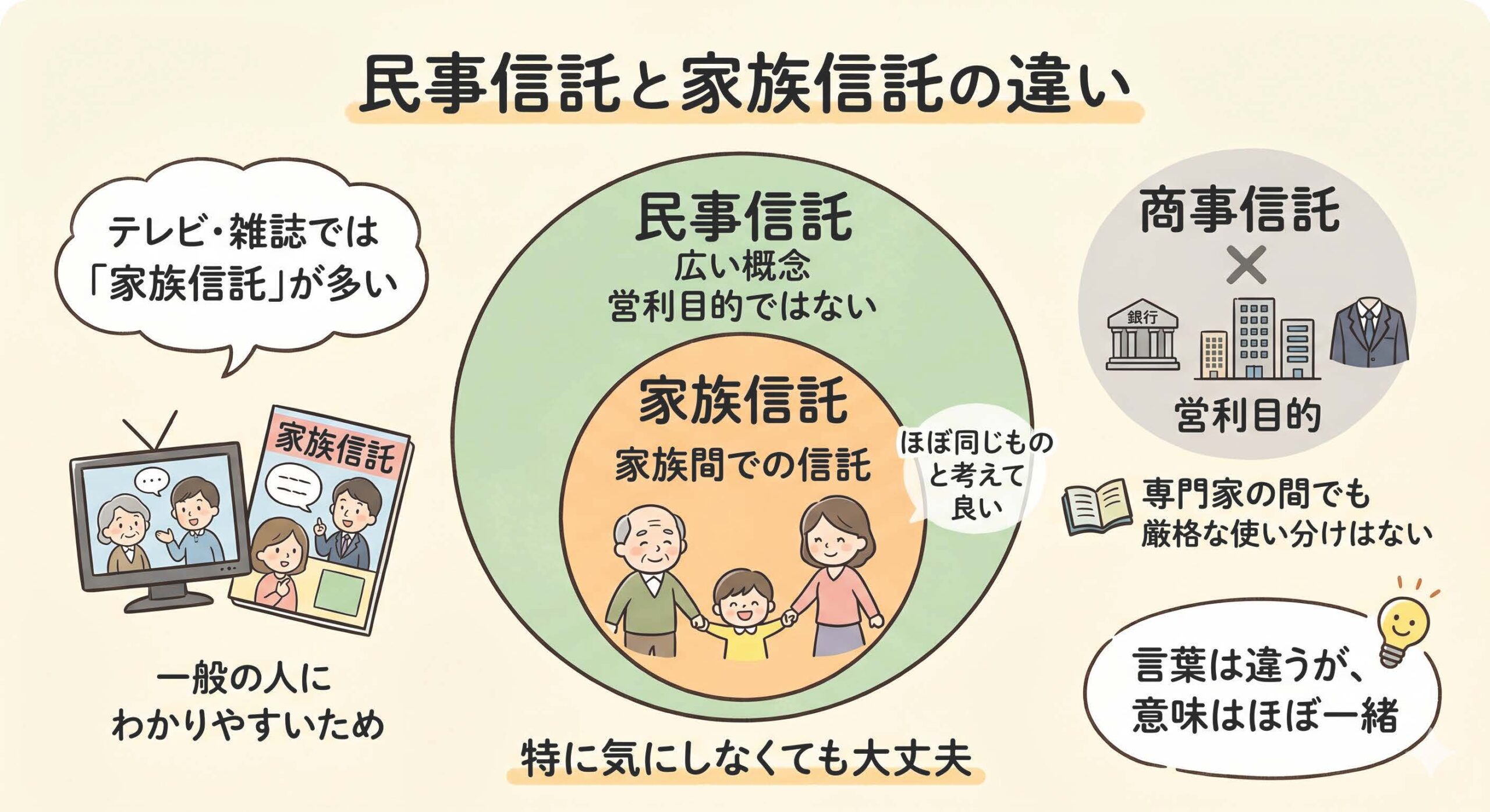 司法書士等の専門家の間で信託の話をする際にもそこまで厳格に使い分けをしている印象はなく、民事信託と言う人もいれば、家族信託と言う人もいる、というようなレベルです。